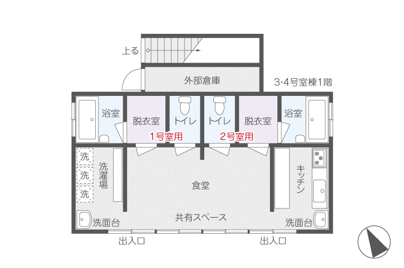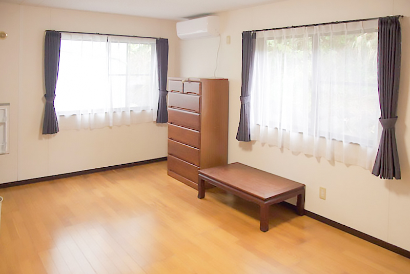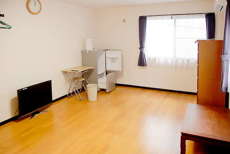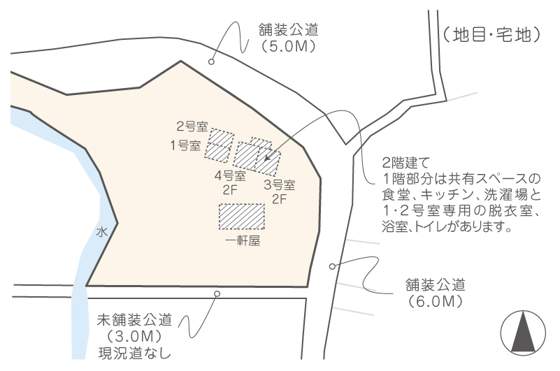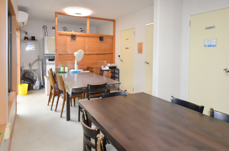 | 建物備考 | 室内にトイレ、浴室、キッチン(IH)、洗濯機置き場はありません。 3・4号棟の1階のトイレ、浴室、台所、洗濯乾燥機を使用してください。 部屋の電気代のみ借主負担。 |