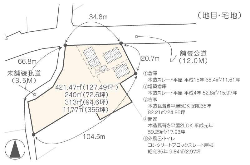 建物備考 建物面積 ①倉庫38.4㎡/11.61坪、②増築倉庫52.8㎡/15.97坪、③古家82.21㎡/24.86坪、④新家59.29㎡/17.93坪、⑤外風呂・トイレ9.84㎡/2.97坪 合計242.54㎡/73.34坪