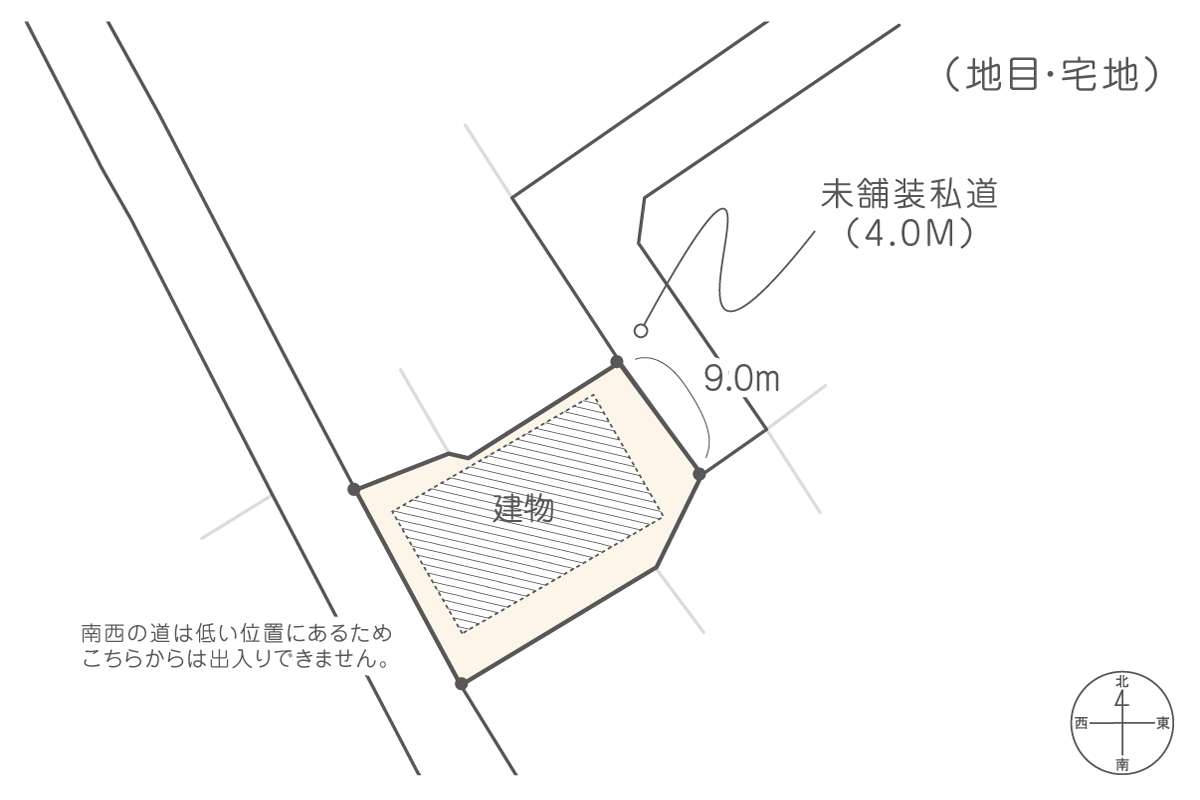 接道備考 南西の道は低い位置にあるためこちらからは出入りできません。