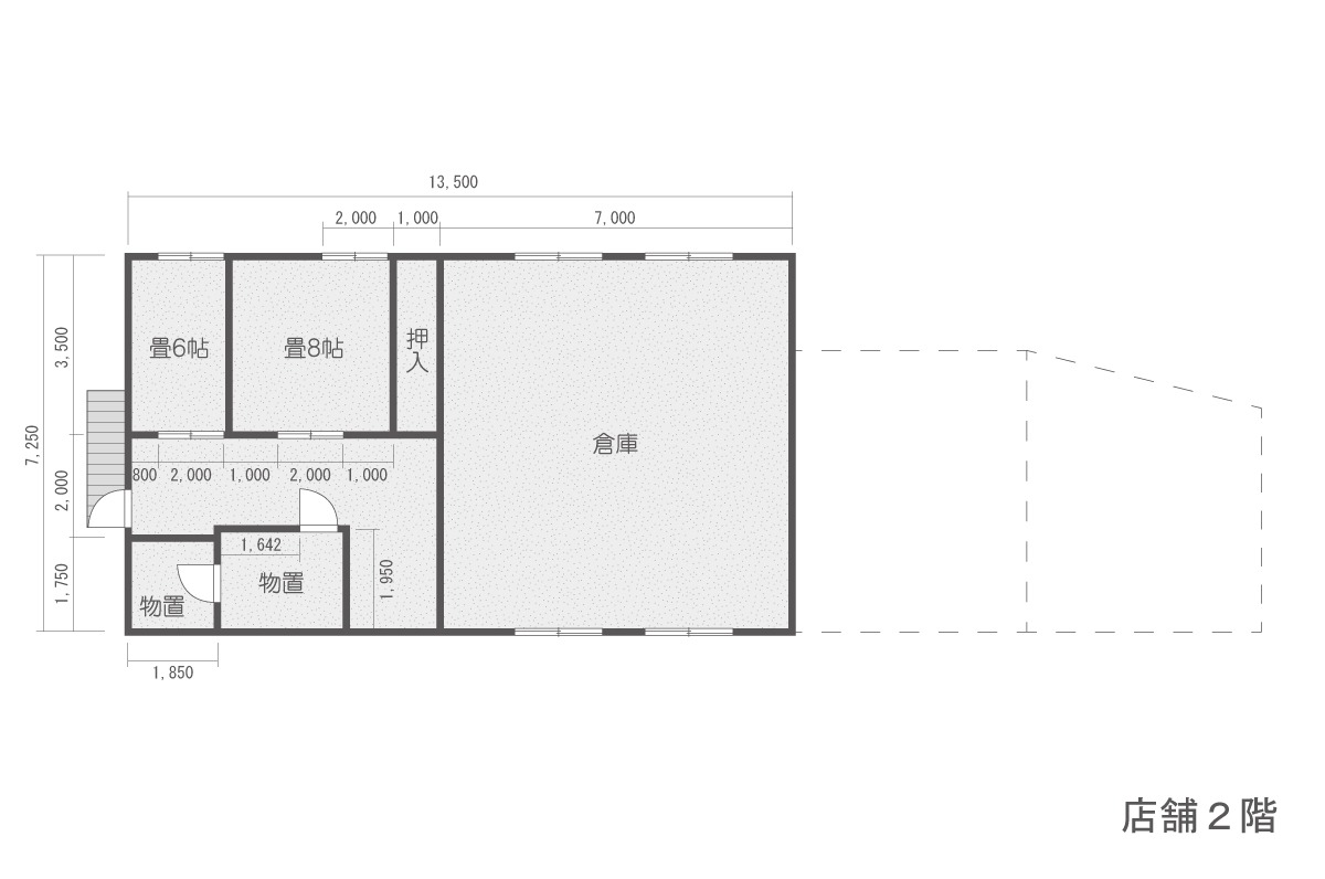 | 間取備考 | 二階へ上がる外階段は取り外したためありません。ひさしも取り外しています。 店舗は1LDK、倉庫1R、二階の居宅は間取り不明 |